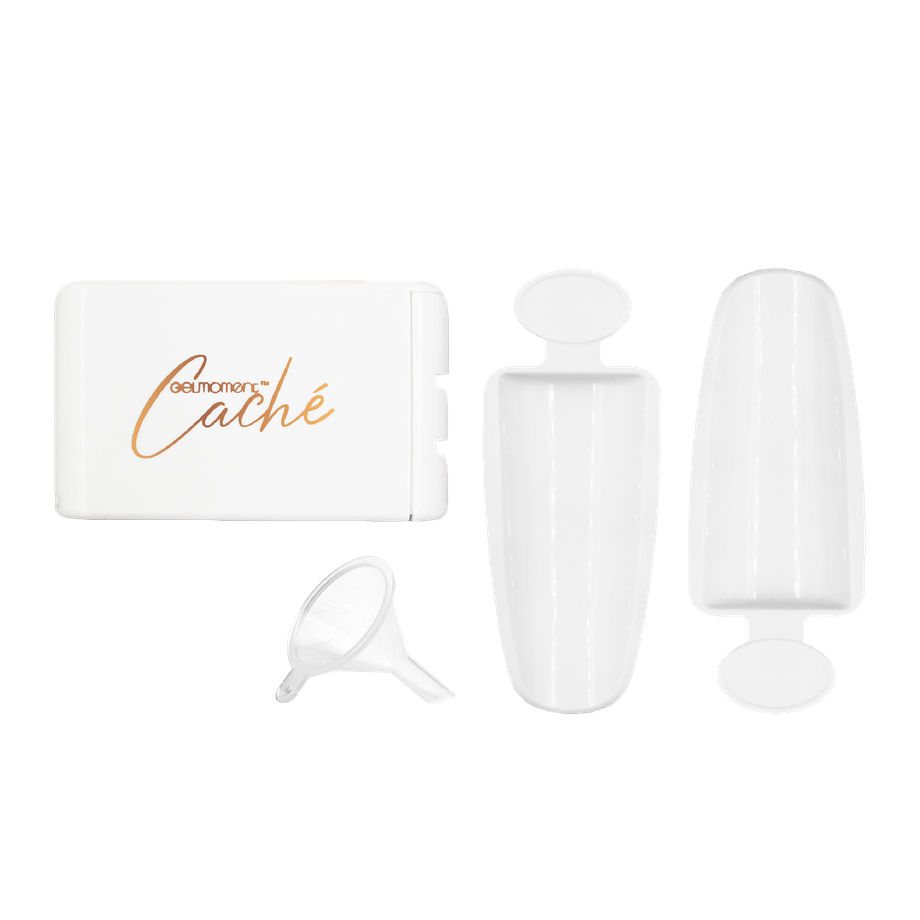 Gelmoment caché, a convenient recycling system that reduces product waste when creating beautiful nail art. Caché increases the ease of cleaning up with its two-tray design that collects and reuses excess powders and glitter effectively.
